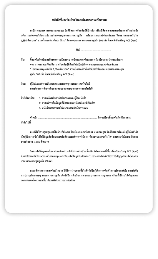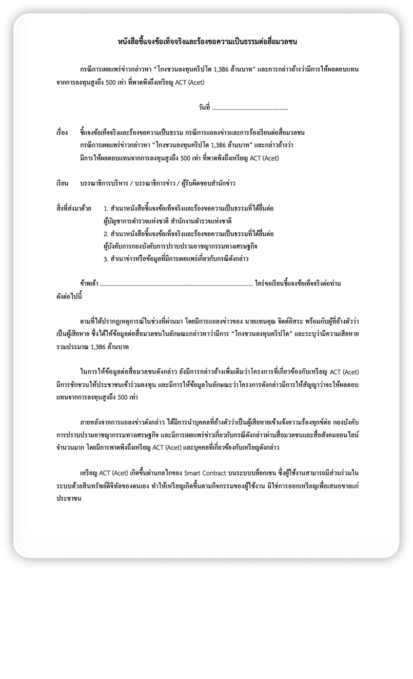 และยินยอมให้ใช้ข้อมูลดังกล่าวประกอบหนังสือชี้แจงข้อเท็จจริงต่อหน่วยงานรัฐและสื่อมวลชนตามวัตถุประสงค์ของหนังสือฉบับนี้